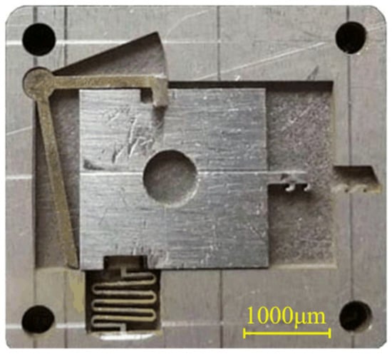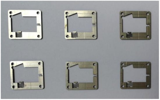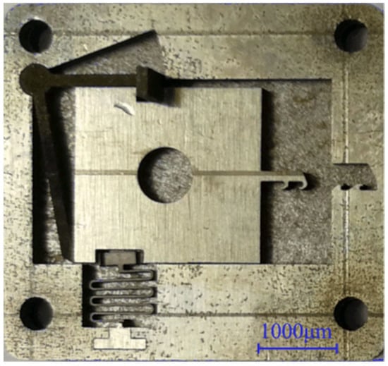 The processing accuracy of the microspring and V-shaped groove is the key factor for ensuring the safety and launch reliability of the setback arming device. In addition, there is a clear positional relationship between the microspring, the V-shaped groove, and the setback slider, so the processing error and positioning error must be strictly controlled during processing. Additionally, it is very important to reasonably arrange the steps in the processing procedure. The microspring was fabricated through a combination of multiple cutting and destress annealing steps. Although the flexural deformation of the microspring was significantly improved, deformation still existed. If the “microspring before the V-shaped groove” processing procedure is followed, the positional accuracy of the V-shaped groove cannot be guaranteed. Therefore, the “V-shaped groove-microspring-frame” procedure was adopted during processing, and the processed sample is shown in Figure 24.