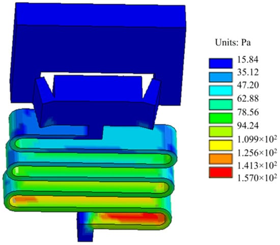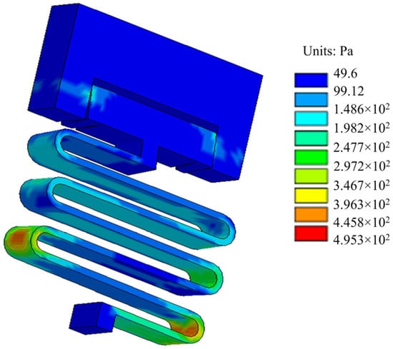 The setback load at launch is set to 12,000 g, and the simulation time is set to 10 ms. The setback slider moves away from the arming slider under the action of the load, approaches the arming slider under the action of the microspring restoring force, and collides with the obstructing inclined plane of the arming slider. After the collision, the setback slider moves away from the arming slider again under the action of the inertial force, and this process is repeated until the inertial force energy is completely exhausted. Finally, the angle of the V-shaped groove at both ends of the setback slider becomes larger, and it gets stuck on the arming slider. Figure 18 shows the stress distribution nephogram of the setback arming device at 10 ms. The maximum stress value in the figure is 157 Pa, which is less than the allowable stress of a nickel material. Figure 19 shows the time–displacement curve of the setback slider at launch. The figure shows that the displacement of the setback slider increases slowly at the beginning of the movement process, the setback slider starts to move away from the arming slider after 2.75 ms, and the displacement increases rapidly with time, reaching the maximum value of 0.963 mm at 4.4 ms. Additionally, the displacement of the setback slider produces an oscillation curve under the actions of the inertial force and microspring restoring force. After 9.9 ms, the displacement is stable at 0.452 mm and remains unchanged, indicating that the setback arming device is completely released.