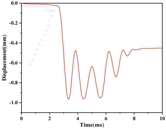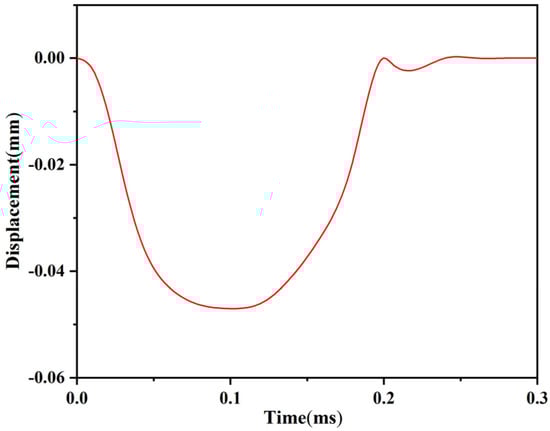 The setback load in service processing is set to 18,000 g in the ANSYS/LS-DYNA software. To observe the displacement of the setback slider after the load is removed, the simulation time is set to 0.3 ms. Figure 16 shows the stress distribution nephogram of the setback arming device at 0.1 ms. It can be seen from the figure that the angle of the V-shaped groove at both ends of the setback slider decreases, but it does not break away from the arming slider. The maximum stress of the setback arming device in the figure is 495.3 Pa, which is less than the allowable stress for a nickel material, so the material does not undergo plastic deformation. Figure 17 shows the time–displacement curve of the setback slider in service processing. The displacement of the setback slider increases rapidly after the movement begins, reaching a maximum value of 0.047 mm at 0.1 ms. When the load is removed, the displacement decreases with increasing time, returning to 0 from 0.24 ms and then remaining unchanged; this indicates that the setback slider returns to the initial position under the action of the microspring restoring force.