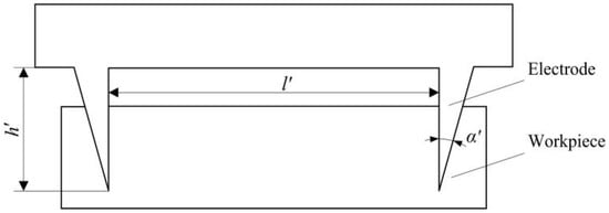 According to the improvement scheme of the setback slider, two V-shaped grooves with a vertical sidewall depth of 0.35 mm, a vertical sidewall distance of 0.15 mm, and a sharp angle of 16° need to be processed on a setback slider with a thickness of 0.4 mm. Due to the special shape of the V-shaped groove and the strict requirements of dimensional accuracy and position accuracy, it is difficult to use wire EDM (WEDM), and EDM is generally used instead. EDM has unique advantages for processing precision structures such as narrow slits and sharp grooves [33,34]. This method uses forming electrodes to process workpieces, so it is necessary to prepare special electrodes for processing V-shaped grooves. To ensure the dimensional accuracy and positional accuracy of the V-shaped groove and improve the processing efficiency, the electrode shapes are designed to be two triangles that correspond to the V-shaped groove. The distance between these two electrodes should be equal to the distance between the vertical sidewalls of the V-shaped groove. In addition, to prevent the discharge phenomenon on the connection surface between the electrode and the workpiece, the height of the electrode should be appropriately increased. The processing scheme of the V-shaped groove is shown in Figure 20. In the figure, the distance between the two electrodes is l′ = l = 1.5 mm, the electrode height is h′ = 0.9 mm, and the sharp angle is α′ = α = 16°.