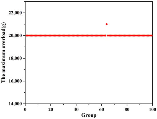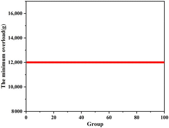 Figure 28 shows the maximum overload that the improved setback arming device can be withstood in the mechanical impact test, and Figure 29 shows the minimum overload that the improved setback arming device for safety release in the centrifugal overload test. Table 10 shows the statistical results. It can be seen from the table that the test results of the two groups fall within the tolerance range, which satisfies the “3σ criterion”. Taking into account the influence of machining errors and test conditions, the statistical results show that the improved setback arming device can guarantee the safety of service processing and the reliability of launch. The maximum overload that can be withstood in service processing is 20,000 g, and the minimum overload for safety release during launch is 12,000 g.