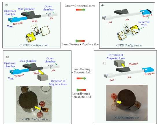 (a) Normally closed configuration of the capillary wax valve. It can be switched to open mode by melting the wax plug blocking the channel (using a laser) and spinning the disc to flow the molten wax plug downstream, clearing the channel to open the fluidic channel. (b) The switch from normally open to closed configuration is achieved by melting the ferrowax in the wax chamber using a laser. Under the action of the capillary force, the molten wax flows into the valving channel and seals it, thus switching the valve from normally open to closed configuration. With enough wax in the wax chamber, this process is repeatable. (c) Normally closed configuration of the magnetic wax valve. It can be switched to open by melting the wax plug blocking the channel and the wax reservoir (laser/heating) and moving the wax with the magnet out of the channel, clearing the channel and opening the valve from normally closed to open configuration. (d) The switch from normally open to closed configuration (magnet wax valve) is achieved by melting the ferrowax in the wax chamber (using laser) and moving the wax with the magnet into the channel. This reversibly changes the configuration from normally open to closed configuration. Yellow arrows show the direction of the magnetic force.