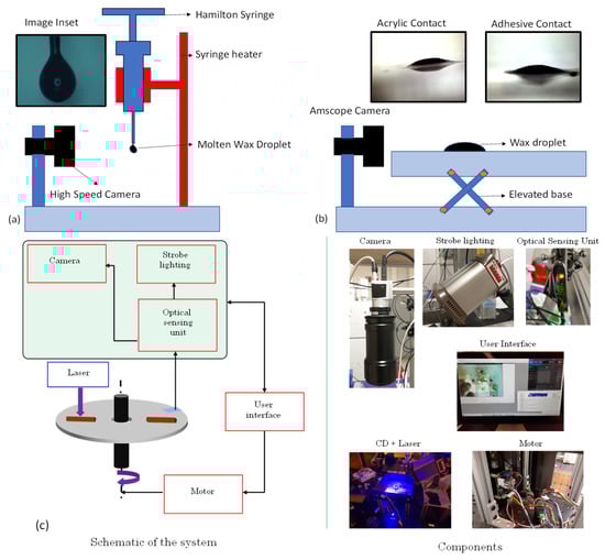 Both surface tension coefficient of the ferrowax and its contact angle with the acrylic surface and with the adhesive surface were measured. The surface tension of the ferrowax is calculated by the pendant drop methodology [21] wherein a Hamilton syringe filled with the ferrowax is heated (Heater Kit-1LG, New Era Pump Systems, Inc., Farmingdale, NY, USA) until the ferrowax melts and a drop is suspended from the syringe’s needle. The image of the wax droplet is captured using a high-speed camera (18W15, Kron Technologies, Burnaby, BC, Canada) (Figure 2a and Supplementary Video S1). The captured image is analyzed with the ImageJ software to deduce the surface tension coefficient. The calculated surface tension coefficient for the ferrowax is 0.051 +/− 0.005 N/m.