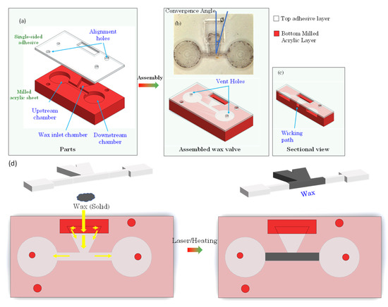 Alternatively, the wax can be injected in molten form using a heated Hamilton syringe (Figure 3a). The valve assembly sequence is presented in Figure 2b,c. The top layer of this assembly consists of the single-sided adhesive sheet that contains the openings for vent holes, alignment holes, and openings for loading the wax in the wax chamber. The bottom layer is an acrylic layer machined to provide for the upstream chamber, the wax inlet chamber, the valve channel, and the downstream chamber. The layers are pressed together using a roller (B07YDNKSH6, Akiro, Shenzhen, Guangdong, China, Amazon, USA) to activate the pressure-sensitive adhesive that binds the layers together.