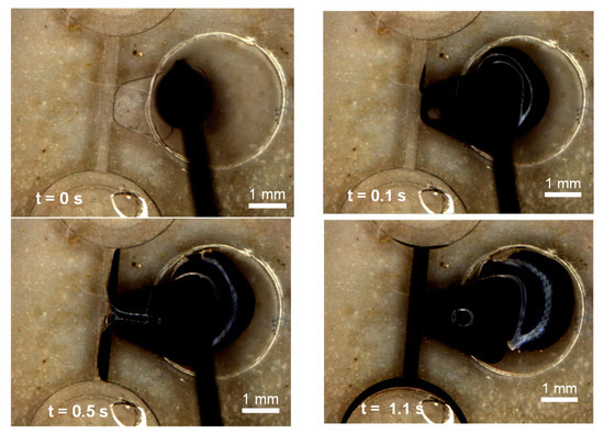 The small contact angles between the wax and the contacting material (either 15° or 19°) result in a concave liquid meniscus that advances from the wax reservoir towards the junction with the valve channel. The propulsion of the wax meniscus by capillary force can be seen in the simulation results in Figure 6a–d (and in Supplementary Video S3). These simulation results match well with the observed experimental outcomes presented in Figure 4 and discussed in previous sections.