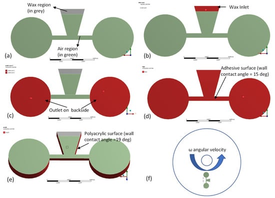 Finite element analysis (FEA) of the actuation of capillary wax valves was performed using ANSYS Fluent software (ANSYS Inc., Canonsburg, PA, USA). Transient two-phase flow simulation of the molten ferrowax and air was implemented (as shown in Figure 5a). In Figure 5a, the initial condition for this simulation is depicted where the volume fractions of the ferrowax and the air are kept at 1 and 0, respectively, in the wax chamber (the grey region) and, correspondingly, 0 and 1 outside the wax chamber (the green region). In Figure 5b, the inlet (atmospheric pressure vent) is located at the top surface of the wax chamber (in red). Similarly, in Figure 5c, the two outlets (atmospheric pressure vent, in red) are located at the bottom surfaces of the two chambers (inward chamber and outward chamber). The adhesive boundary is defined in Figure 5d, and the experimental value for the wax contact angle of 15 degrees is assigned for this surface. For the acrylic boundary (Figure 5e), a measured wax contact angle of 19 degrees is used. The position of the capillary wax valve on the disc is presented in Figure 5f, where the “inward chamber” is located closer to the center of the disc and the “outward chamber” is located further away from the center of the disc. The fluidic channel has a radial orientation, and it connects the “inward” and the “outward” chambers. The centrifugal force pushes the fluid from the inward chamber towards the outward chamber. A contact mesh matching is performed between the intersection of the wax region and the air region to establish the common nodes at the interface and to ensure that flow is continuous.