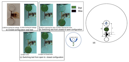 The main function of the capillary-driven wax valve is to close the valve without any leakage, open the valve without any obstruction, and switch reliably between its open and closed configurations. Three tests were defined to evaluate the robustness and performance of the valve: (a) closed configuration seal test; (b) switching test from closed to open configuration; and (c) switching test from open to closed configuration. In test (a), the valve (in manufactured seal mode) was examined for potential leaks at a spin rate of 6500 rpm for 4 min. No leakage of the sealed channel was observed as demonstrated in Figure 7a(i,ii). In test (b), the ferrowax blocking the channel in a normally closed wax valve was remelted by heating it with a laser (500 mW for up to 5 s). The disc was then spun at 6500 rpm for 4 min and after the wax moved into the downstream chamber, the fluid was transferred from the upstream chamber into the downstream chamber through the fluidic channel as seen in Figure 7b(i,ii). In test (c), the wax was reintroduced in the wax chamber inlet and heated. The molten wax driven by capillary forces blocks the fluidic channel and is allowed to solidify. After the wax is solidified in the channel, the inward chamber is filled with fluid and the CD is spun at 6500 rpm for 4 min (see Figure 7c(i,ii)). No leakage was observed, confirming a repeatable operation of the wax valve.