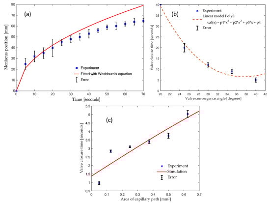 (a) Plot of the time of vs. advancement of the molten ferrowax meniscus in the fluidic channel under capillary action. The experimental values are indicated by blue cross marks (where the error bars represent one standard deviation). The red line indicates the trend corresponding to Washburn’s Equation (Equation (9), with W = 9.47). The simulation predictions of the molten wax location (Washburn’s Equation) are within 18.75% of the error margin with respect to experimental results. (b) Plot depicting the relationship between the valve convergence angle (see Figure 3b for definition) and the time it takes for the molten wax to reach the fluidic channel. The error bars represent one standard deviation. Dotted line is a fitted curve to the blue crosses. (c) Relationship between the valving channel cross-section and the response time. The red line shows the simulated curve and blue crosses represent experimental measurements done using the Hamilton syringe setup where we use a Hamilton syringe to input the wax.
