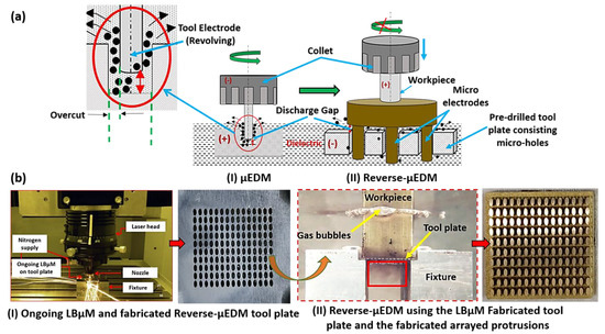Here, the Reverse-µEDM is mainly used to fabricate single or arrayed 3D protruded structures of varying aspect ratios and cross-sectional profiles [25]. The basic tool-work configuration and polarity alteration of µEDM to achieve Reverse-µEDM is depicted in Figure 1a. In Reverse-µEDM, generally, a work material (anode) with a flat face is attached to the non-rotating spindle fed towards the tool plate (cathode). Figure 1b shows that the tool plate has an array of micro-holes in a pattern similar to the required array of protruded structures. These micro-holes are fabricated by progressive LBµM head, customized to gain an identical positional accuracy. Thus, it is possible to fabricate precise micro-holes using LBµM in any profile, which is almost impossible through any other mechanical micromachining.