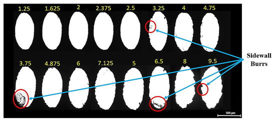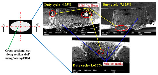 The optical images of all the fabricated micro-holes at different duty cycles are shown in Figure 5. It is observed that the micro-holes fabricated at lower duty cycles have shown good dimensional accuracy with minimal burr formation than the micro-holes fabricated at higher duty cycles. It may be due to the better efficiency of molten metal removal from the cut kerf at lower duty cycles. Post examination of fabricated micro-holes reveals the striation patterns on the holes’ side wall at lower moderate and higher duty cycles, as shown in Figure 6. It is a well-accepted fact in LBµM that the formation of either uniform or non-uniform striation patterns on the holes’ side walls is solely associated with the molten metal viscosity and purging of assisting gas. The purging gas enhances the cooling effect and generates the drag force on the molten metal through the cut kerf, which may stick to the micro-holes’ side walls. The rate of flow of molten metal (fluid strain) also changes due to the movement of the nozzle head along with the desired holes’ profile, which alters the amount of molten metal purging outside the cut kerf of the micro-holes. The lesser molten metal’s viscosity and surface tension along the tool plate thickness results in the retardation of the molten metal streamlines to accumulate at the bottom of the micro-hole. This results in better dimensional accuracy and a shallow striation pattern at lower duty cycles than the ejected melted metal at higher duty cycles, shown in Figure 6 (recorded data are tabulated in Table 2).