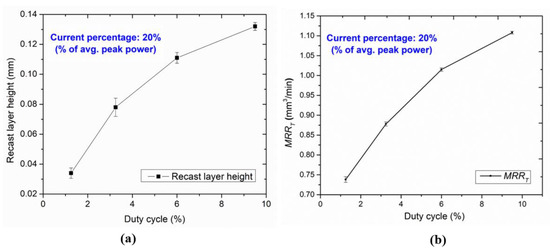 Variation of (a) recast layer heights (b) MRRT with duty cycles.