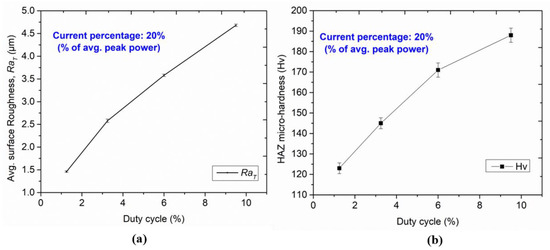 Variation of (a) RaT, and (b) HAZ micro-hardness with duty cycles.