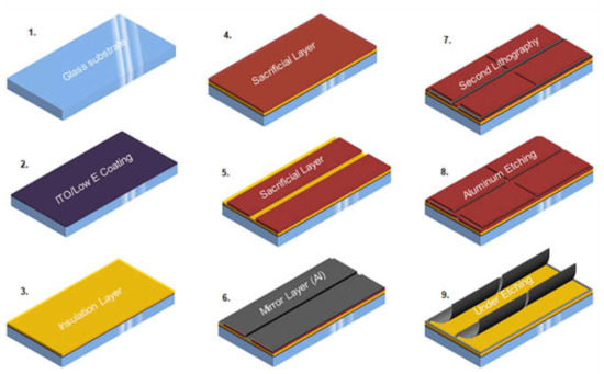 The light can be steered by changing the angle of the metallic foils inside the array by electrical actuation. The fabrication steps during the process of the MEMS-based micromirrors are reflected in Figure 2.