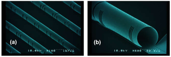 Aluminum () is generally used in micromirrors as a reflectance layer due to its properties such as good electrical conductivity, high reflectivity, corrosion resistance [8,9] and low wear resistance [10,11,12]. To realize electrical actuation, the MEMS micromirror system consists of two electrodes separated by an isolation layer. The isolation layer mostly comprises silicon dioxide (), which is the first choice due to its benefits such as providing good insulation between two conducting layers, easy availability, low cost, transparency and high mechanical flexibility [13,14,15,16,17]. The actual fabricated structure of the MEMS-based micromirrors is shown in Figure 3.