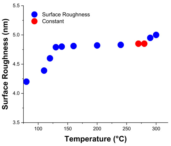 In Figure 4, it can be seen that the value of the surface roughness changes abruptly with the change in the temperature from 80 to 130 °C, representing maximum change. From 130 to 160 °C, the change in the value of the surface roughness is minimum, reflecting slow variation. Likewise, from 200 to 270 °C, the surface roughness increases consistently with the increase in the temperature. Consequently, from 270 to 280 °C, the value of the surface roughness remains constant. Onwards, with the increase in the temperature from 280 to 300 °C, the value of the surface roughness tends to increase congruently.
