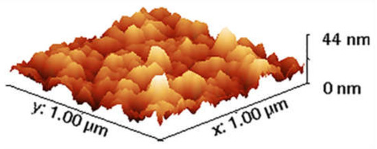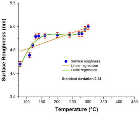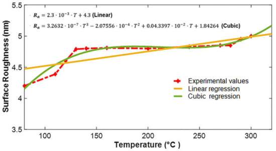 Figure 6 depicts the surface roughness prediction up to a value of using the proposed analytical models based on linear and cubic regressions. Analyzing the trends in the graph, the linear regression model shows a partial agreement with the experimental data; however, it deviates completely from the given values above and below the data range. Moreover, when comparing trends of the cubic regression model, it shows a good agreement with the experimental values in the range of 80 to 300 °C. After 300 °C, it shows an upward trend in the curve, predicting an increase in the surface roughness. Similarly, a typical AFM image of the surface roughness is presented in Figure 7.