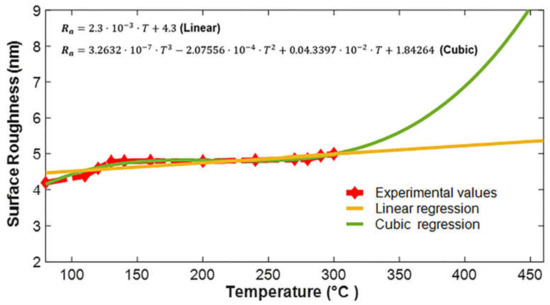 The correlations of the linear and cubic regressions between the two quantities, i.e., change in the temperature and surface roughness, are summarized in Table 4, in order to account for the similarity between the investigated data and predicted data. Moreover, they reflect the prediction of the results for the missing data up to 450 °C.
