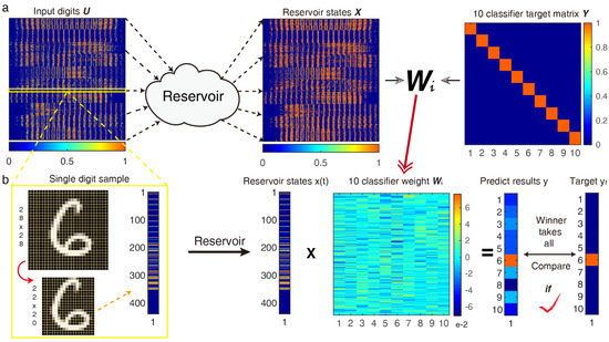 A basic RC system processing of the pattern recognition was performed in the reservoir, as shown in Figure 2a. The original grayscale image 28 pixels × 28 pixels was trimmed to a 22 pixels × 20 pixels image for reducing redundant information. Then, the 22 pixels × 20 pixels matrix was transformed into 1 × 440 temporal sequences of input pulse streams with separation time θ, and the driver carrier signal was multiplied at a certain frequency and then placed into the HNL reservoir, which is constructed by 440 “neural” nodes. Finally, we obtained a 440 × 10 readout network that was used for classification after training. In order to perform the MNIST classification function, ten appropriate target functions were constructed as ten linear classifiers; each is a polynomial function composed of the optimal weight coefficient vector , and to prevent the overfitting caused by excessive feature information during the training stage, we introduced ridge regression with Tikhonov regularization (L2 norm) to solve this problem and obtain the minimum mean square error between predicted value and target value by adjusting the regularization coefficient .