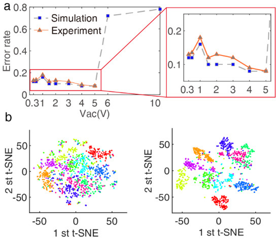 Optimal Duffing nonlinear working interval for handwritten digit recognition. (a) Classification error rate results after simulation and experiment by changing the driving voltage . The best–recognized accuracy is when , and , . (b) Two–dimensional representation of the two t-SNE components: left one with , right one with in (a).