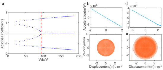 Figure 5a shows the number of abscissa coefficients varies (equilibrium positions) as the variation of under (determined by the resonator size). Here, the static pull-in voltage can be derived by , which detailed analysis in [35] under different and conditions. In the analysis model, the can be represented as the boundary when the perturbations are assumed to be small enough, the method of multiple scales is generally used to investigate the dynamic nonlinear behavior of the resonator with small for explaining the above experimental results. However, the excitation amplitude to be studied exceeds the boundary condition of theoretical analysis; hence, we constructed the numerical model using Formula (1) to study the changes in nonlinear vibration by the phase portraits. As shown in Figure 5b–e, which illustrates the displacement–acceleration and the displacement–velocity phase portraits for an AC voltage of 5 V and a pull-in AC voltage 5.3 V in the fixed DC bias 30 V, the dynamics system results verify the optimal operating point occurs at the edge of chaos, as observed before.