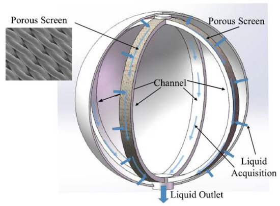 The liquid acquisition process is as follows: the liquid that contacts the porous screen will be wicked [4,5,6] by the tortuous micro flow path formed between wires of the screen so that the whole screen would be wet; when the system pressurizes the ullage of tank, the surface tension of the liquid that has been filled within the screen pores will stop the vapor from penetrating the screen, while the liquid will be driven into the channel through the screen by the pressure difference effect; eventually, the liquid flow along the channel and towards the outlet while the vapor is retained in the tank (see Figure 2a), and the pure liquid-phase propellant is thus acquired.