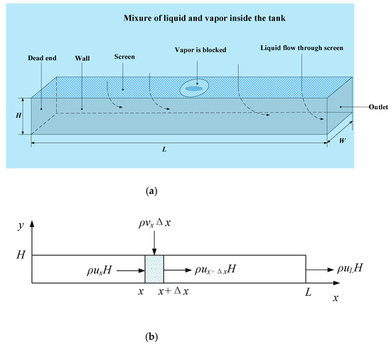 Consider a rectangular channel with length L, width W, and height H; the coordinate origin is located at the dead end of the channel (see Figure 2a). During the outflow process, the liquid in the tank flows through the screen (with the injection velocity , while undergoing a FTS pressure drop ), into the channel, and then along the channel to the outlet. The average transverse velocity of the channel cross-section (represented by ), as well as and , varies along the x direction, so the subscripts, such as , and L, are used to mark the x coordinates of the variable.