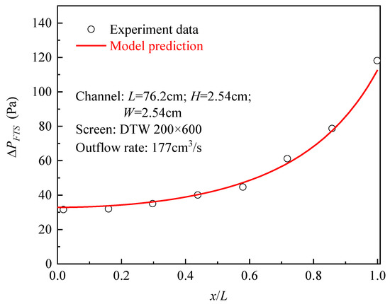 To validate the model, a set of experiment data from [18] is compared with the model prediction about the distribution of FTS pressure drop. The experimenters selected room-temperature distilled water as the working fluid and then conducted a horizontal outflow test using a channel (equipped with the screen of DTW200 × 600) with L of 76.2 cm, H of 2.54 cm, and W of 2.54 cm. Under the flow rate of 177 cm3/s, they measured the local at eight points along the length direction. The model prediction and the experiment data show good fitness, with an average error of 4.8%. (Figure 3).