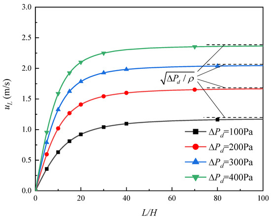 For the 2-D flow process discussed here, only L and H exert influence. In order to learn how L and H affect , we investigate 15 channels with different sizes under the same conditions, the calculated are listed in Table 1. All of these channels are being driven by the same of 519 Pa and are equipped with the same screen of DTW325 × 2300. The values in every column of Table 1 are equivalent to each other, which indicates that is a function of the ratio of L to H (i.e., L/H), rather than of L or H individually. Due to this finding, the relationship between and L/H at different was further investigated, with the results shown in Figure 4 (where all the channels are equipped with the screen of DTW325 × 2300).