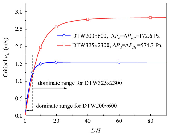DTW200 × 600 and DTW325 × 2300 are chosen as the representative of coarse and fine mesh screens, respectively. Channels equipped with the two screens are investigated under a wide range of L/H, respectively. Since the comparison is conducted with the critical as the evaluation criterion, at each L/H, the channel is driven by its own (i.e., 172.6 Pa for DTW200 × 600 and 574.3 Pa for DTW325 × 2300) [22]. We can see from Figure 5 that the coarse mesh screen enables the channel to get higher critical when L/H is lower than 6.2, but things are opposite when L/H is higher in this case. To interpret, higher outflow velocity can be brought about by both higher driving pressure and lower resistance; in the dominant range for DTW200 600, the lower resistance contributes more to the higher outflow velocity, while in the dominant range for DTW325 2300, the higher driving pressure (allowed by the higher ) contributes more.
