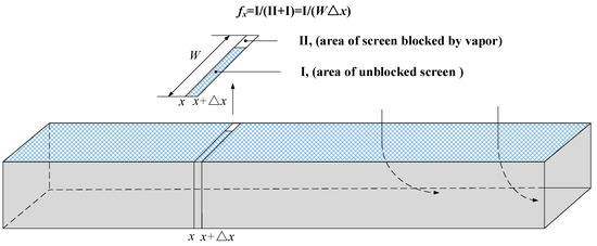 In order to flexibly describe the variable situation of vapor blockage along the channel, we introduce a correction factor fx named “available rate”. It means the percentage of the screen that is not blocked by vapor in the neighborhood of x (see Figure 6). The value of fx is between 0 and 1 to reflect the blocked degree between non and complete blocking. The blockage position can be expressed by adjusting the location of fx along the x-axis while the total percentage of the blocked area can be represented by the value of . It should be noted that does not include the information about how the vapor distributes along the width direction; thus it is only a function of x.