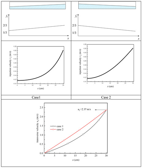 First, we start from the simplest cases: all the blockages are concentrated on a section of the screen (like a “large bubble”). To simulate this distribution mode of the blockage area, we let a segment of be 0 while the rest of this segment to be 1 (see case1~case4 in Figure 7, in which the blocked area is marked by the white part while the available part of the screen is denoted by the blue part). When this blocked area moves from upstream to downstream of the channel, the injection velocity and transverse velocity will show correspondingly various distribution patterns (see Figure 7). In the blocked zone, and remain unchanged, while in the available area, both and increase with x coordinate. Interestingly, all in the four cases get the same value of 2.37 m/s at the outlet of the channel, which hints that the blockage position of a single bubble does not affect the outflow rate.