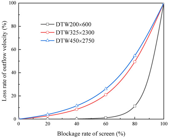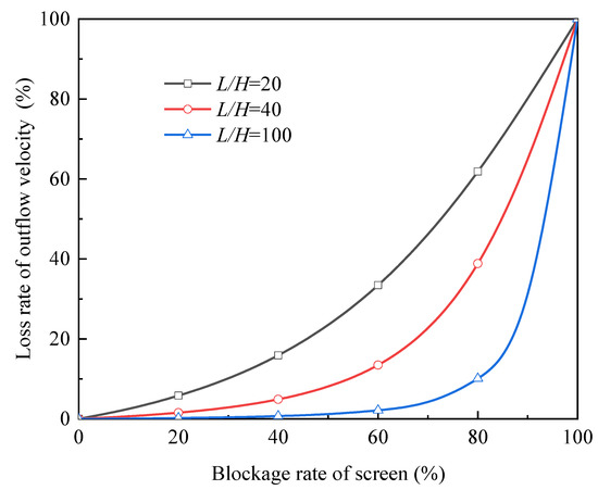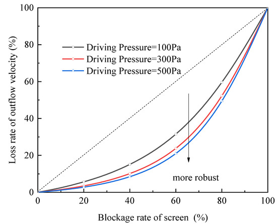 - For a given device and under the same driving pressure, as long as the total area of the blocked screen is given, the loss rate of outflow velocity will not change with the changing blockage position. In other words, only the total area of the blocked screen affects the loss rate of outflow velocity.