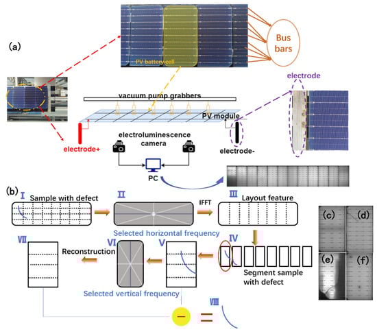(a) The EL imaging system of a PV module inspection pipeline, which activates the EL effect on each module and converts infrared light into grayscale images; (b) the spectrum domain analysis-based method to exploit the periodic features and locate the defects; (c) normal PV cell in a defect-free module; (d) PV cell with cracks; (e) PV cell with cracks and breaks; (f) PV cell with speckles.