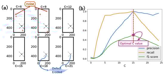 (a) detected defect pixels under different values of C. Some false detections are highlighted with red a circle. With a higher C value, true defects are eroded. (b) Precision, recall and f1-score change according to C value upon a training set of 20 samples.
