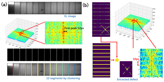Defects can be easily extracted by subtracting the reconstructed image from the feature map after preprocessing. The process has two stages, as shown in Figure 1b. First, the vertical dividing lines are reconstructed by filtering the spectrum horizontally. Then the dividing lines can be used to segment the PV module into 12 cells. After segmentation, the spectrum is filtered within each PV cell vertically to reconstruct the horizontal busbars. The selection of the spectrum is based on prior knowledge of the number of PV cells and the number of busbars. Since there are 12 PV cells in a PV module, and 10 slices in one PV cell, the spectrum is filtered by maintaining the column index, which is a multiple of 12 in the center row, and the all-row index, which is multiple of 10 in the center column.