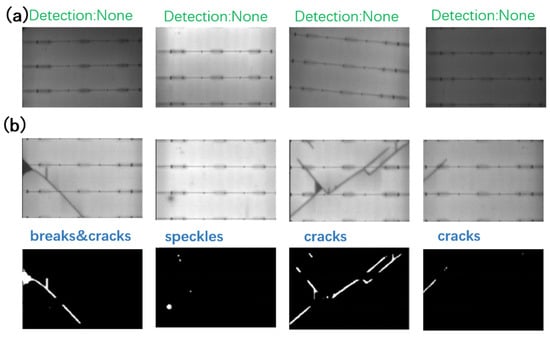 The proposed method was tested on a set of PV-module EL images, including defect-free samples and defective samples, with all the above-mentioned types. The experiments were carried out on a laptop with an Intel(R) Core (TM) i7-8550U CPU @ 1.80 GHz 2.00 GHz processor. The EL images were around 400 × 3000 pixels with a variation of, at most, 20 pixels in width as a result of stochastic placing and cropping. The images had an 8-bit gray scale depth. The input of the system was the original-sized EL image. The system output the pixels of the cracks, breaks, and speckles. The average processing time for one 400 × 3000 EL image was about 0.13 ms, which was sufficiently fast for online detection. Figure 6a shows a set of defect-free PV cells with varying illumination conditions. No pixels are detected as defects in these images. Figure 6b shows a few samples with different shapes of cracks, breaks and speckles.