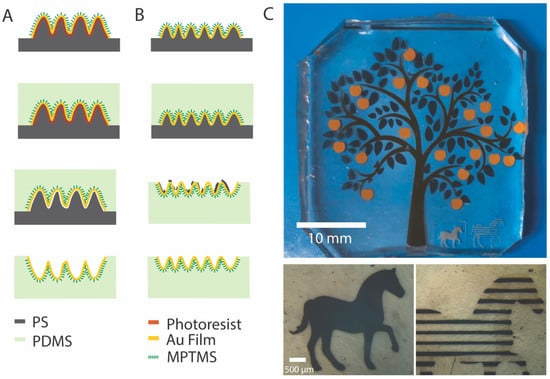 All samples with a gold film as the interface to be transferred to the elastomer were immersed in 5 mM (3-Mercaptopropyl) trimethoxysilane (MPTMS) (95% MPTMS, Sigma-Aldrich, MO, USA) aqueous solution for 1 h, rinsed with water and dried with nitrogen gas. Samples with SiO2/ITO films interfacing the elastomer were treated using a Harrick High Power Plasma Cleaner (PDC, Harrick Plasma Inc., Ithaca, NY, USA) for 1 min at high power (30 W). At the same time, the base of PDMS and curing agent (Sylgard 184 silicone elastomer kit, Dow Corning Corporation, Corning, NY, USA) were fully mixed in a 10:1 mass ratio and degassed in a desiccator with a mechanical vacuum pump until air bubbles were removed. The degassed PDMS was cast onto the surface-treated structured films, then put in an oven at 60 °C for 4 h to be cured.