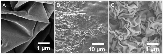 Scanning electron microscope images show the differences arising from of the two transferring methods. (A) Topography of a 20 nm-thick Au wrinkled film transferred onto PDMS using a sacrificial photoresist layer. Topography of a 20 nm-thick wrinkled gold film transferred without photoresist onto PDMS (B) with polystyrene residue after the acetone bath step and (C) after rinsing with toluene.