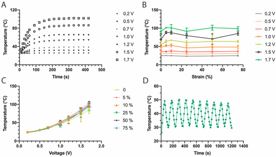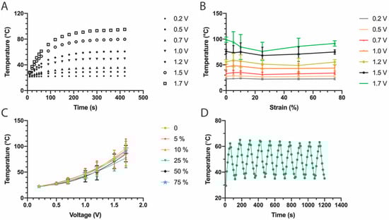 Characterization of stretchable ITO/Au/ITO heaters. (A) Temperature profiles under varying applied voltage (0.2–1.7 V). (B) The plateau temperature changes with various voltages but remains similar for any given voltage under different strains. (C) Changes in temperature vs. voltage for various applied strains (each series represents a given strain value). (D) Cycling on/off response under an applied voltage of 1.5 V shows the reproducibility of the temperature reached at the plateau.
