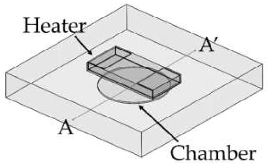 A PCR microchip with a chip resistor heater was designed, and finite element method (FEM) software was used to simulate the temperature profile of the microchip when heated by the chip resistor heater. As shown in Figure 1, a circular PCR reaction chamber was placed inside a glass substrate, and the heater was placed above the chamber. The dimension of the glass substrate was 12.7 mm × 12.7 mm × 2 mm, small enough to be placed in a portable thermocycler. The diameter of the chamber was 5 mm, and the height was 0.1 mm, in order to hold 2 μL of PCR sample to be amplified. The temperature profile around the chamber was simulated while moving the position of the heater. Three distances between the heater and the chamber (600 μm, 950 μm, and 1300 μm) were used for the simulation. The chamber’s inlet and outlet were not considered in the simulation.