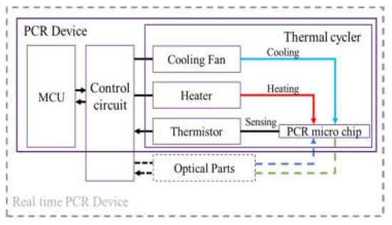 An overview of the PCR device, including a thermal cycler, control circuit, and microcontroller unit (MCU).