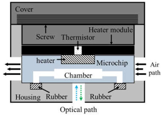As shown in Figure 3, the thermocycler module consisted of a heater module, a microchip, rubber, and a housing with a cover. The heater module included the chip resistor heater and the thermistor for heating the microchip and sensing the temperature of the microchip. A blower fan, used to accelerate the cooling of the microchip, rotated at 3400 rpm and blew the hot air in the thermocycler module to the outside. The microchip’s inlet and outlet were sealed with rubber. In addition, a screw structure was manufactured on the cover and the housing. Rotating the cover to close the housing caused the rubber, the microchip, and the heater module to be pressed together with strong pressure, which prevented PCR sample evaporation and improved heat transfer between the chip resistor and the microchip.