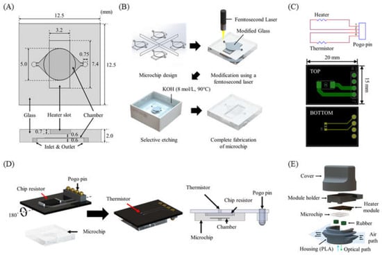 As a material commonly used in PCR microchips, glass was selected for this device. Polymers and glass are widely used because they are biocompatible and optically transparent. Typically, polydimethylsiloxane (PDMS), polymethyl methacrylate (PMMA), and polycarbonate (PC) are used in low-cost polymer microchips. However, PDMS has gas permeability and difficulty in mass production. PMMA’s low glass transition temperature of 105 °C makes it unsuitable for the PCR denaturation step at high temperatures (about 95 °C). PC has a disadvantage in optical detection in real-time microchip PCR systems because of its autofluorescence [24,25]. In contrast, glass has high light transmittance, heat resistance, electrical insulation, and high thermal conductivity compared to polymer [26]. Glass has its own limitations, of course, including the long fabrication time and effort required for micromachining, along with the need for special tools or a clean room facility. Using a two-step selective laser-induced etching (SLE) process, these limitations were overcome. The first step of the process involves modifying the target area of the glass chip using the nonlinear absorption of a femtosecond laser. Next, wet etching is used to remove the portion modified by the laser. This process allows the fabrication of a 3D hollow structure inside one single glass without a bonding process, making it useful for rapidly fabricating a prototype glass microchip [27,28,29]. Earlier, we reported an optimization method for fabricating 3D structures in a single glass sheet using the SLE process [30,31]. This study used the optimized SLE process conditions to fabricate a PCR reaction chamber and a chip resistor slot in the glass microchip.