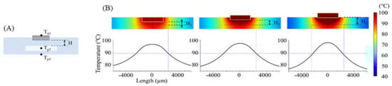 The temperature distribution over the entire PCR microchip was obtained via FEM simulation. As shown in Figure 5, heat transfer from the heater was analyzed in three instances: for a distance between the chip resistor heater and the reaction chamber (H) of 600 μm (H = H1 = 600 μm), when the heater was inserted half into the microchip (H = H2 = 950 μm), and when the heater was placed on the microchip (H = H3 = 1300 μm). Figure 5B shows the temperature distribution on the microchip when the temperature of the sample in the chamber was heated to 94 °C. Additionally, a distance-temperature graph was obtained from the temperature data for line A-A’ of Figure 1 that passed through the chamber’s center, showing a temperature variation within 2.3 °C, 2.6 °C, and 3.2 °C when the distance H was H1, H2, and H3, respectively.