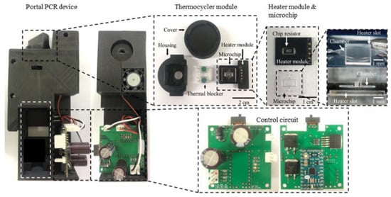 We fabricated a portable PCR device to amplify DNA samples to demonstrate the proposed combination of a microchip and chip resistor heater. Figure 2 illustrates the PCR device, consisting of a thermocycler, a control circuit, and a microcontroller unit (MCU). The thermocycler comprises a microchip, a chip resistor heater, a blower fan, and a thermistor. The control circuit includes peripheral circuits for switching current, and the MCU controls the PCR thermocycling temperature. In addition, a hole is included at the bottom of the thermocycler to allow the addition of an optical detection component to the thermocycler for expansion into a real-time PCR device.