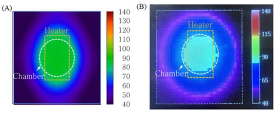 (A) Simulation result visualizing the temperature distribution on the surface of the microchip (B) Thermal image of the microchip surface using a thermal imaging camera. The temperature profile of the sample inside the chamber was uniform.