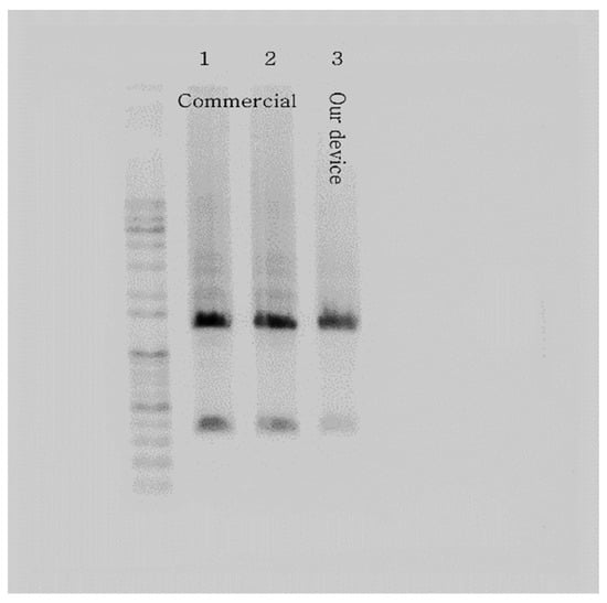 Following the thermocycling experiment, we verified the DNA amplification of our PCR device with the templated DNA (ZFP36). After loading the PCR mix into the microchip and a PCR tube using a pipette, we placed the samples in our PCR device and a commercial PCR machine, respectively. The resulting amplicons from the microchip and the PCR tube were extracted and subjected to conventional gel electrophoresis throughout the experiment. The outcome showed strong bands, validating the performance of our PCR device using the microchip with the chip resistor as a heater. Figure 9 illustrates the gel electrophoresis results, including gel bands of amplified DNA, presenting a comparison of the performance of a commercial PCR machine and our PCR device. In addition, the total PCR time of the commercial PCR was about 74 min, while our PCR device took about 59 min (20% faster).