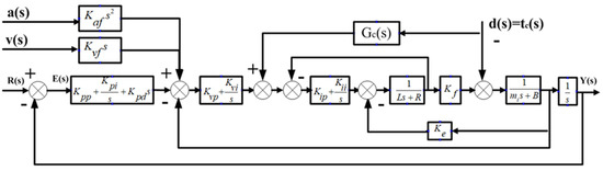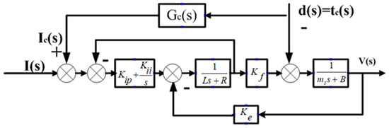 The FTS system is a closed-loop system with position feedback driven by a linear motor. The control system uses a three-ring control structure of position, speed and current, with PID/PI/PI as the control mode, respectively. The basic PID control model of the FTS can be obtained via the linear motor mathematical model, as in Figure 3.