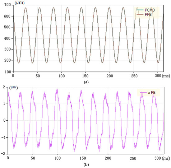 Figure 12a shows the curve of instruction position and feedback position of load machining that used the compound PID control of input feedforward and dynamic prospective compensation with overall good tracking performance. Figure 12b shows the tracking error curve of load machining in this control mode. The maximum tracking error is ±1.9 μm, which is much better than the previous tracking error used in the control of speed and acceleration feedforward PID.