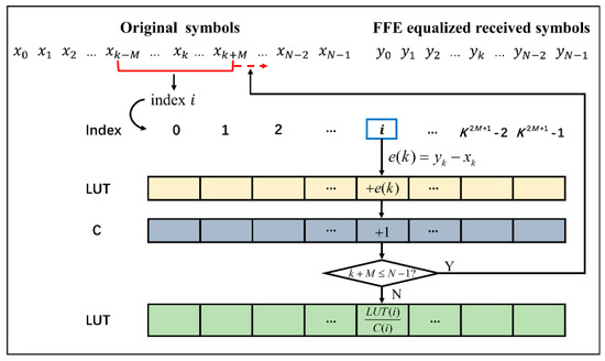 2M + 1 is defined as the memory length of the LUT. The 2M + 1 symbols having the same form compose a pattern, and the same pattern is mapped to the same index. In addition to initializing an LUT of length to all zero, another table C with the same length as LUT is also needed to count the occurrence number of the same pattern. The error between the middle symbol x(k) and the corresponding FFE recovered symbol y(k) is calculated and can be written as:
